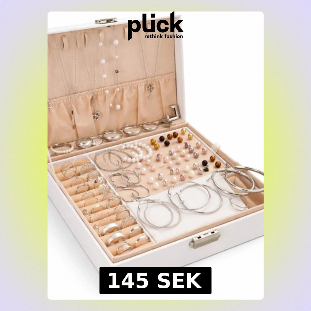 Nytt set i silverfärg. 4-i-1: örhängen, halsband, ringar (totalt 86 st). Perfekt för vardag eller present. Helt nytt, oanvänt.