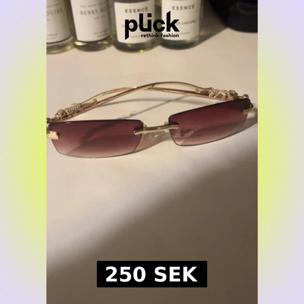 Snygga solglasögon med guldiga bågar och rektangulära, bruna glas. På sidorna finns en cool leoparddetalj i metall som ger en unik och trendig look. Perfekta för dig som vill sticka ut och addera lite edge till din stil. Köpt förra året för 399kr ej använt.