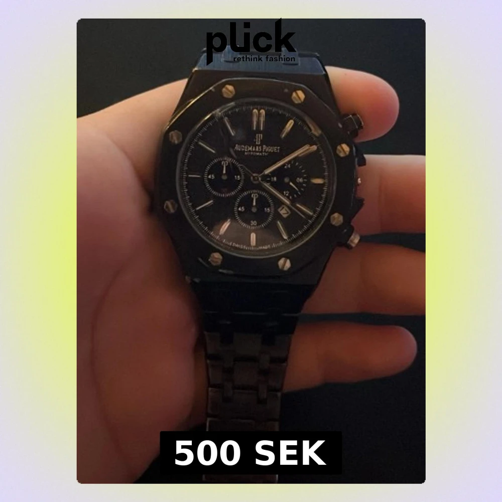Snygg svart Audemars Piguet Royal Oak herrklocka med länkarmband i metall. Klockan har kronograf, datumvisning och tydliga indexmarkeringar. Boetten är åttakantig med synliga skruvar och urtavlan är svart med silverdetaljer.