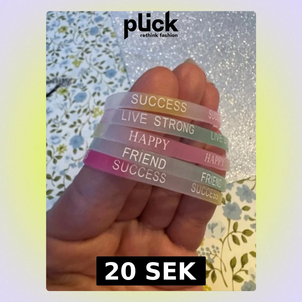 Armband med budskap/ord. Så som best friends, success, happy mm. Olika färger . Säljes 5st för detta pris. Slumpmässiga armband där jag tar olika färger med olika ord . Kan gå och köpa större mängder . När dom har varit i ljuset så lyser dom i mörkret. Material silikon