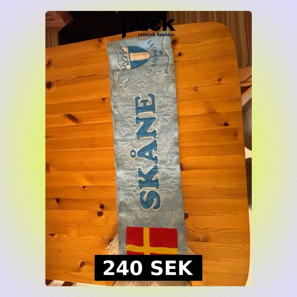 Säljer en ljusblå halsduk med Malmö FF och Skåne-tryck. Ena sidan har Skånes flagga i rött och gult, andra sidan har svensk flagga i blått och vitt. Tydliga broderade detaljer och fransar i ändarna. Perfekt för dig som vill visa ditt stöd för MFF och Skåne.