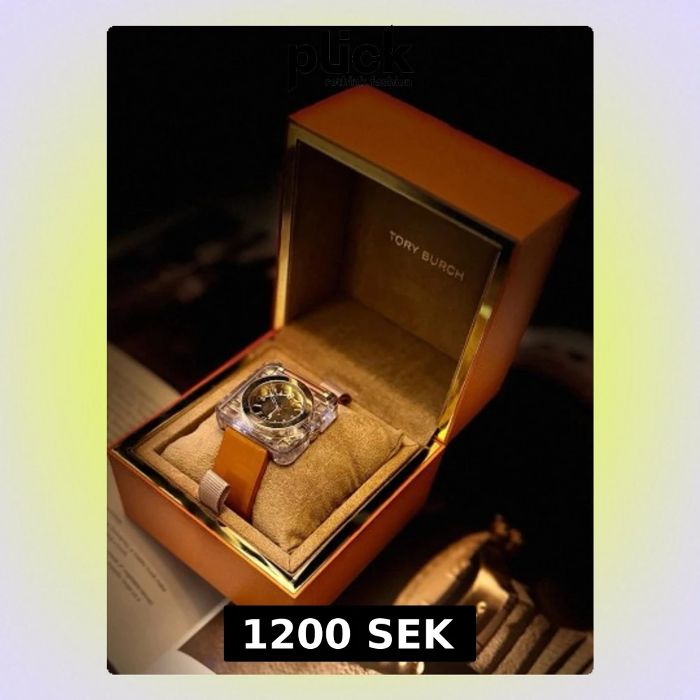 Snygg klocka från Tory Burch med fyrkantigt guldigt ur och brunt läderarmband. Kommer i original orange ask med logga och medföljande dokumentation. Perfekt accessoar för dig som gillar stilrena detaljer och lyxig känsla.