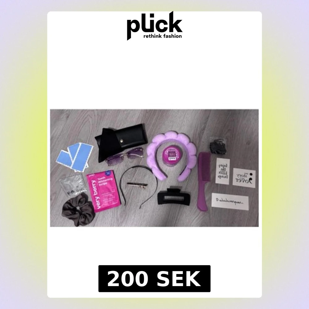 Kit med solglasögon, 4 tandblekningar, tatueringar, snoddar, hårvax, kam, klämma, hårspänne, 2 diadem, tejp till löshår