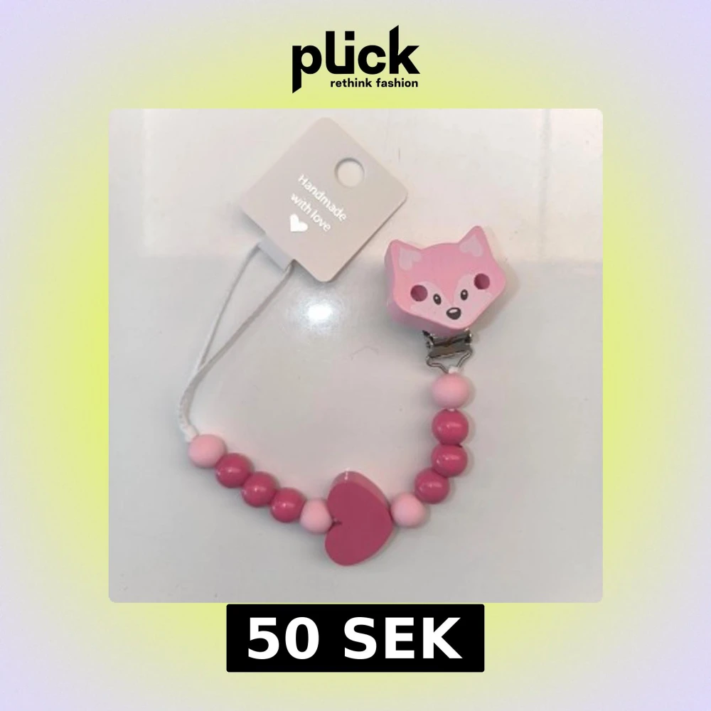 Handgjord napphållare i rosa nyanser med ett sött rävhuvud och hjärta. Perfekt för att hålla nappen nära och säker. Tillverkad med kärlek och omtanke. BPA pärlor, silikon och trä.