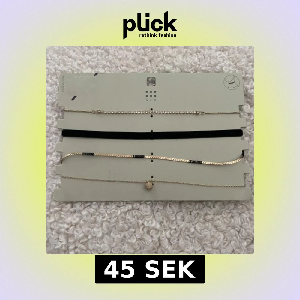 Paket med fyra snygga halsband från SIX. Ett halsband med glittrande stenar, ett svart sammetsband, ett guldigt kedjehalsband och ett tunt guldhalsband med en liten glittrig boll. Perfekt för att mixa och matcha till olika looks.