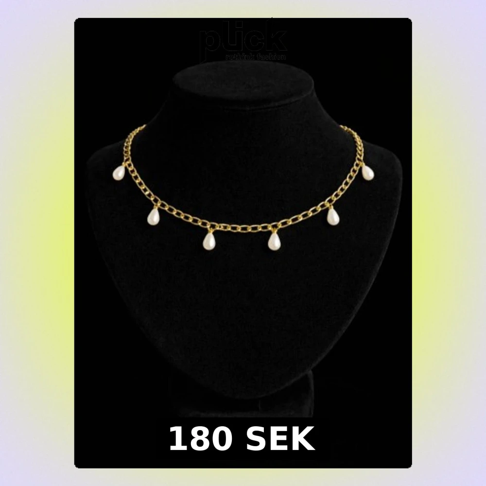 Stilrent halsband i guldfärgad metall med kedja och fem droppformade vita pärlhängen. Perfekt för att ge en elegant touch till din outfit. Klassisk design som passar till många stilar.