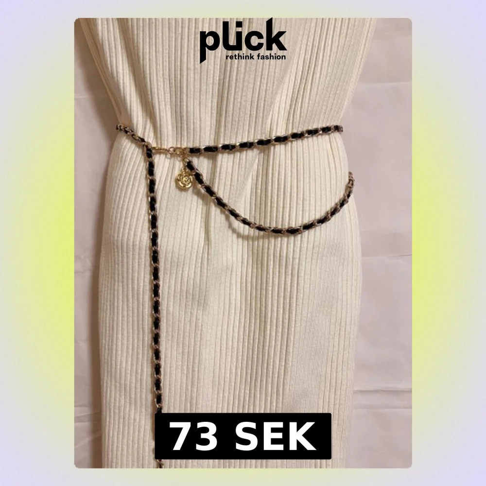 Säljer ett snyggt kedjebälte i guld med svarta inslag och två hängande rosberlocker. Bältet är 100 cm långt och passar perfekt att styla över klänning eller byxor för en trendig look.
