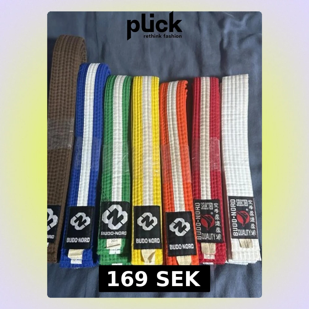 Bilden visar inga västar utan olika färgade bälten från Budo-Nord, troligen för kampsport som karate eller judo.