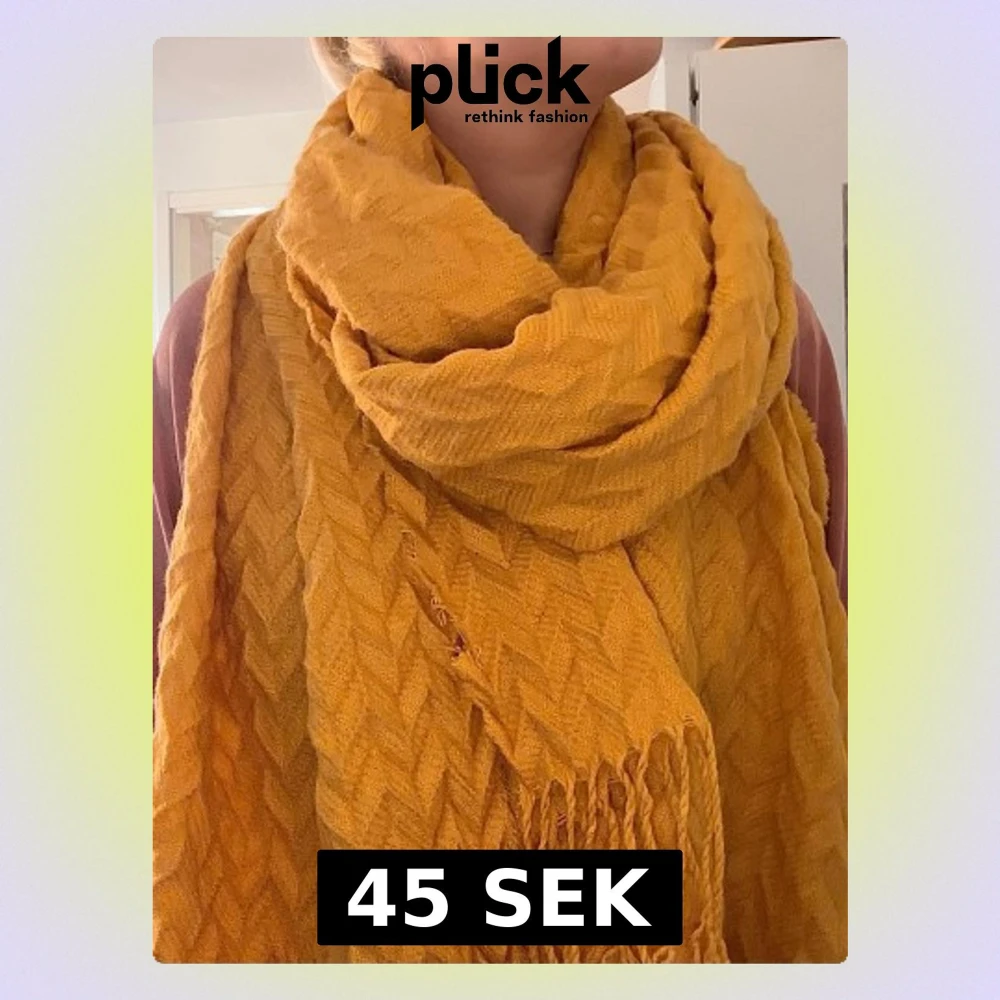 Säljer en bred senapsgul halsduk med vågigt mönster. Defekt: se bild nummer 2. Lite ripped på sidan. Fungerar utan problem och håller en varm. Bra när man vill lägga till lite färg i sin outfit!