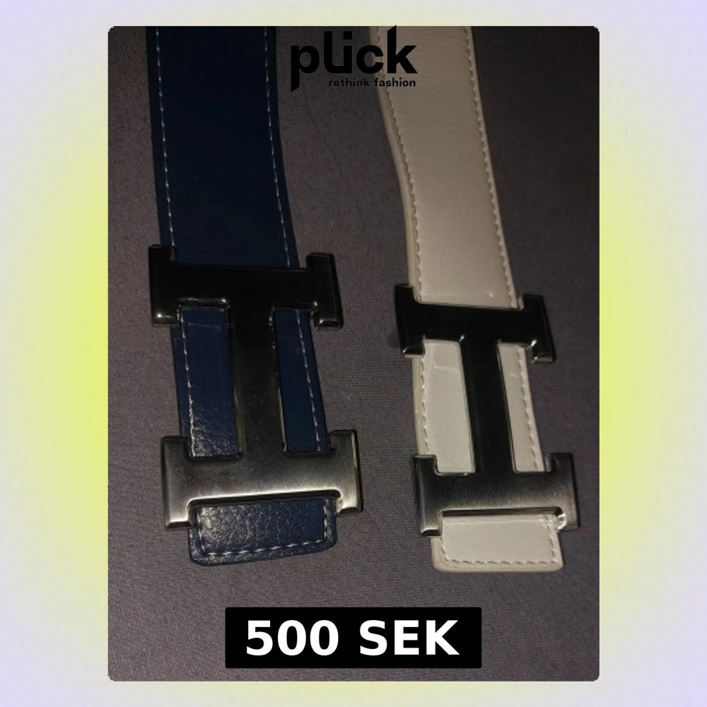 Säljer två stilrena bälten med stort H-format metallspänne. Ett bälte är mörkblått och det andra är vitt, båda i slätt läder med synliga sömmar. Perfekta accessoarer för att lyfta din outfit.