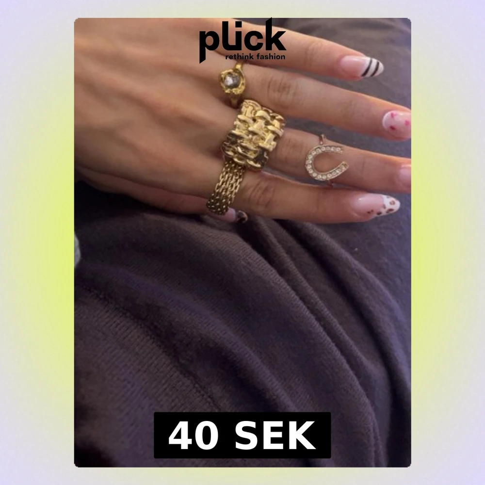 Fyra unika ringar i guldton: en med stor klar sten, en bred med kedjedetaljer och en tunnare med hästskoformad dekoration täckt av små glittrande stenar. Perfekta för att skapa en trendig och personlig stil. 40kr styck