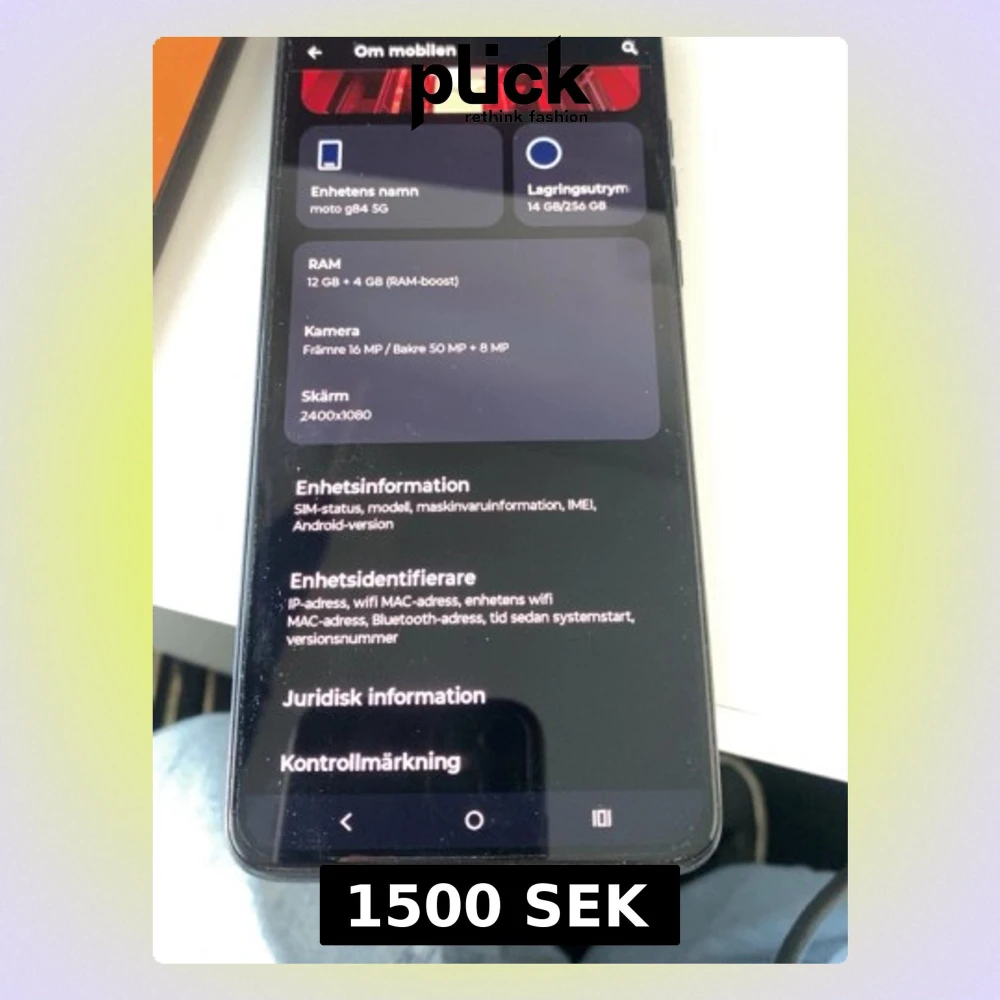 Säljer en Motorola moto g84 5G med 12 GB RAM och 256 GB lagring. Telefonen är svart med stilren design och har en 6,5-tums skärm (2400x1080), trippelkamera bak (50 MP + 8 MP) och 16 MP selfiekamera. Materialet är glas och plast. Perfekt för dig som vill ha en snabb och modern Android.