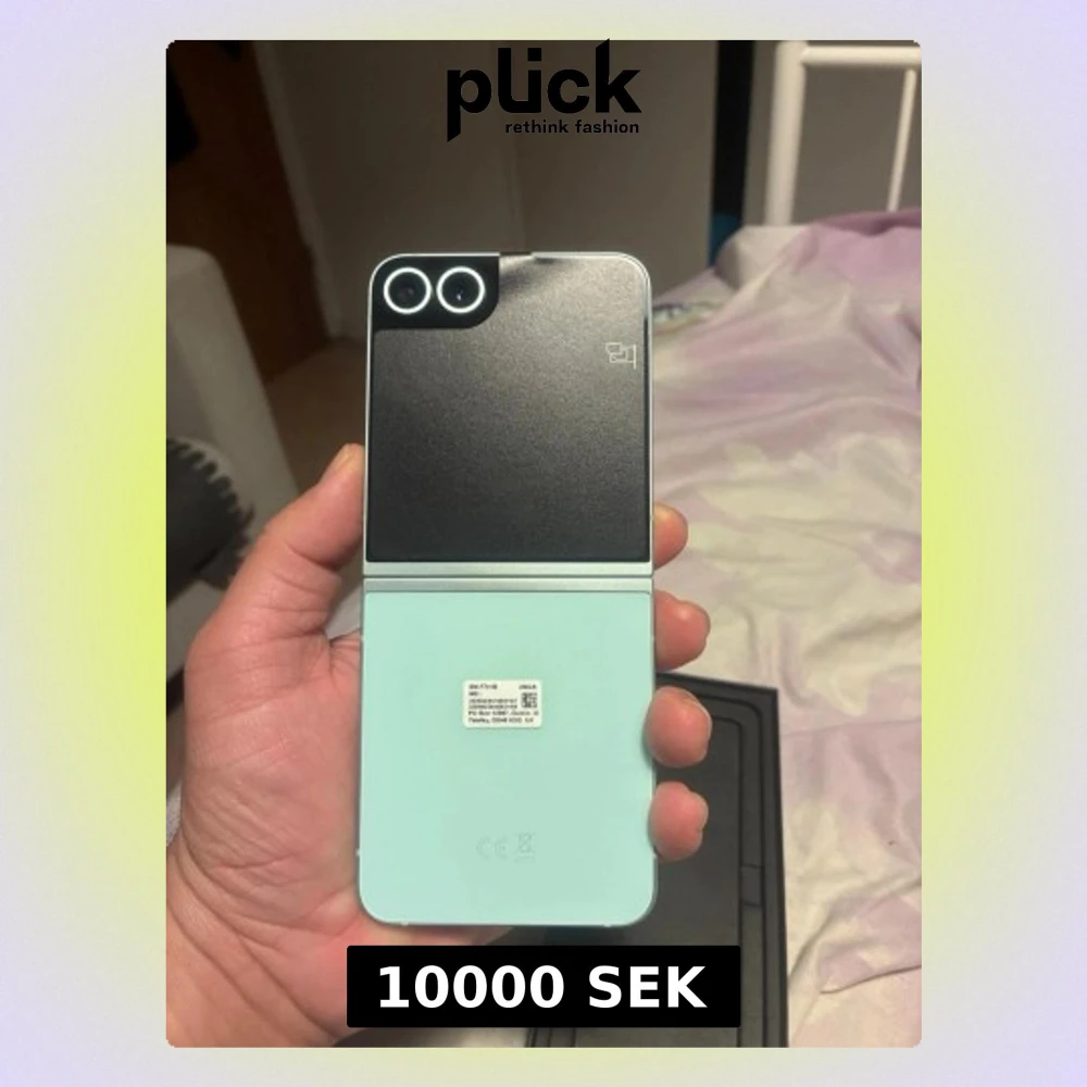 Säljer en Samsung Galaxy Z Flip6 i snygg mintgrön färg med vikbar design. Telefonen har dubbla kameror på baksidan och en stilren svart och grön finish. Perfekt för dig som vill ha en modern och smidig Android-telefon med unik formfaktor.