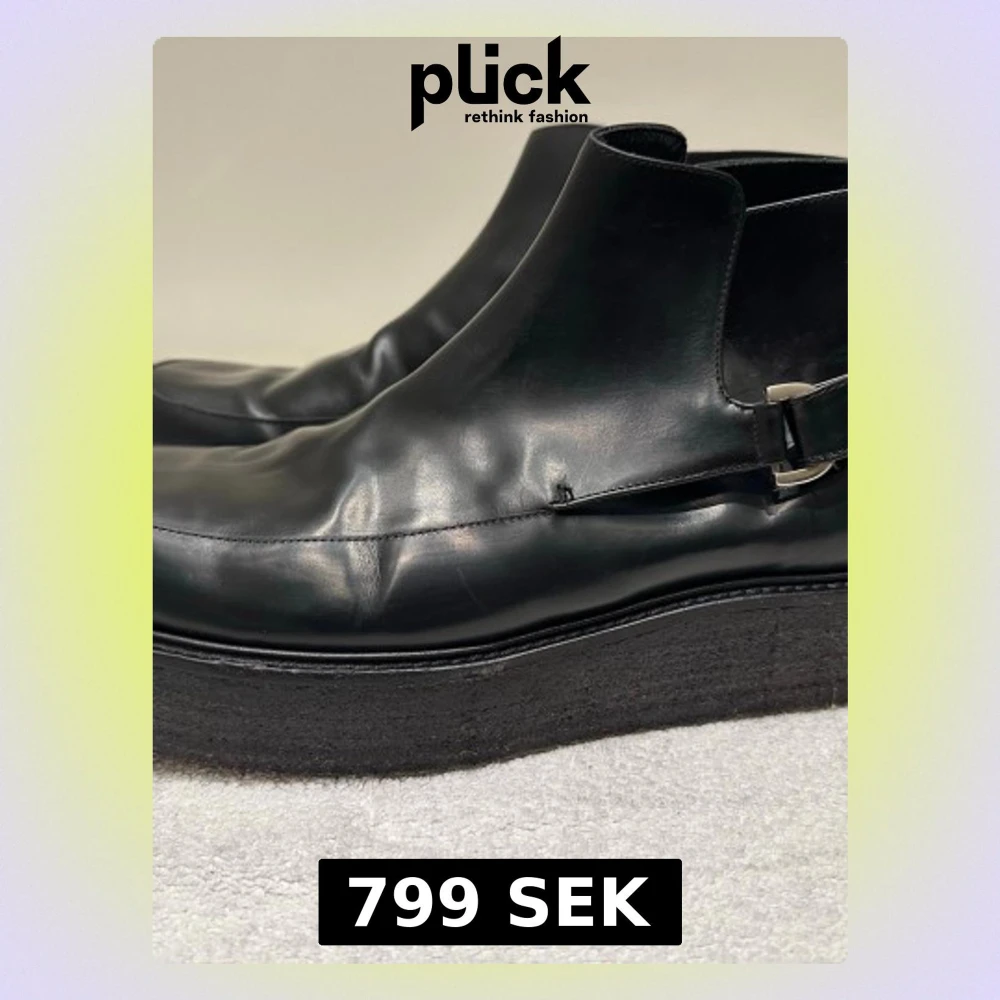 Fina svarta läderboots från Whyred i bra skick. Stilren design utan snörning med spänne på sidan. Knappt använda. Aningen smal design. Säljer då de tyvärr inte passar mina bredare fötter.