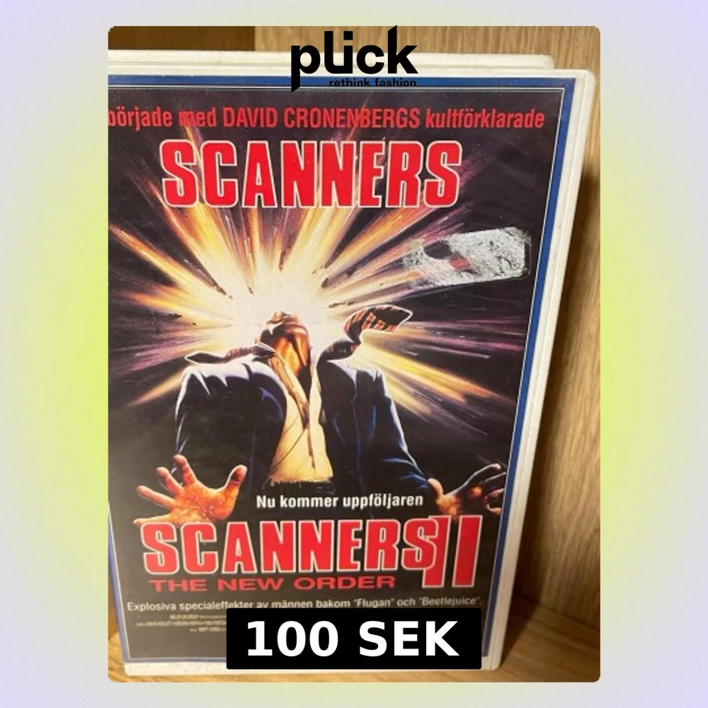 Säljer boken 'Scanners II: The New Order' med ett dramatiskt omslag i rött, svart och gult. Omslaget har en explosion och en person i kostym. Filmen är på svenska och har actiontema med inslag av science fiction och övernaturliga krafter.