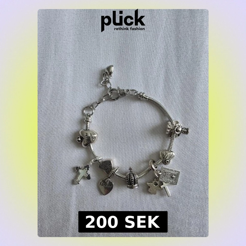 Snyggt silverfärgat armband med flera olika berlocker, bland annat hjärtan med text, ett kors, en krona och en stjärna. Armbandet har en ormkedja och detaljerade hängen som ger en personlig touch. Perfekt accessoar för dig som gillar unika smycken.