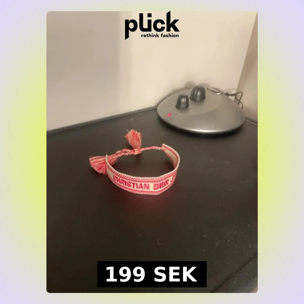 Säljer ett snyggt rosa och vitt tygarmband från Christian Dior med texten 'CHRISTIAN DIOR J'ADIOR' broderat i rött. Armbandet har justerbar knytning med tofsar i ändarna och är perfekt för dig som gillar exklusiva accessoarer med trendig vibe.