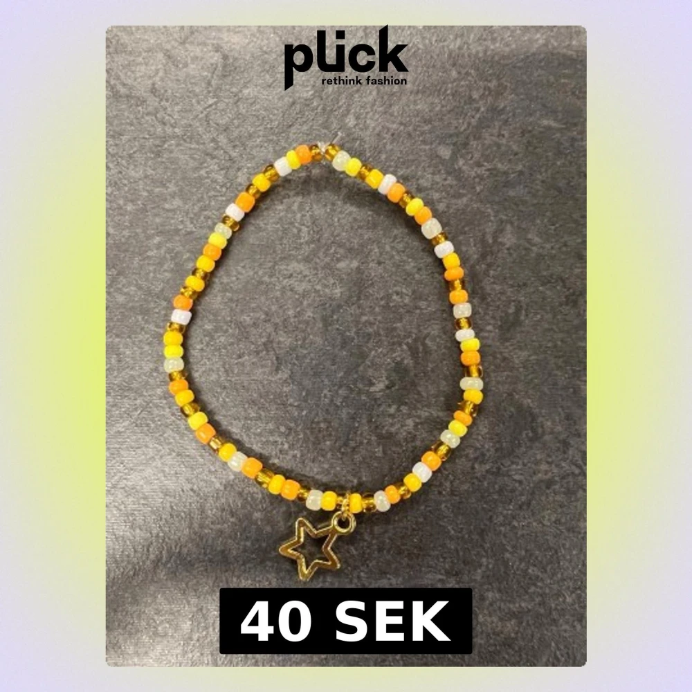 Ett armband med pärlor i gult, orange, vitt och genomskinligt. Armbandet har en guldfärgad stjärnberlock som hänger ned.