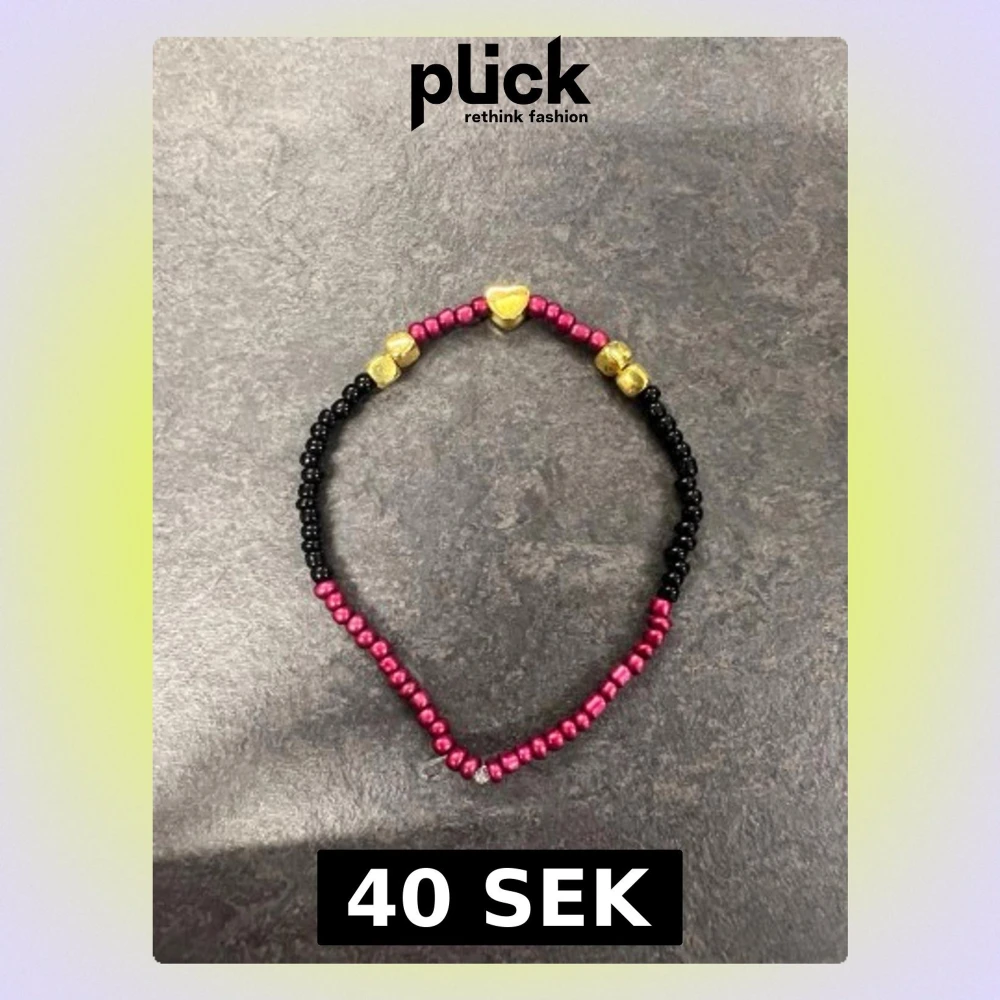 Säljer ett handgjort armband med svarta och röda pärlor samt detaljer i guldfärg, inklusive en hjärtformad pärla.