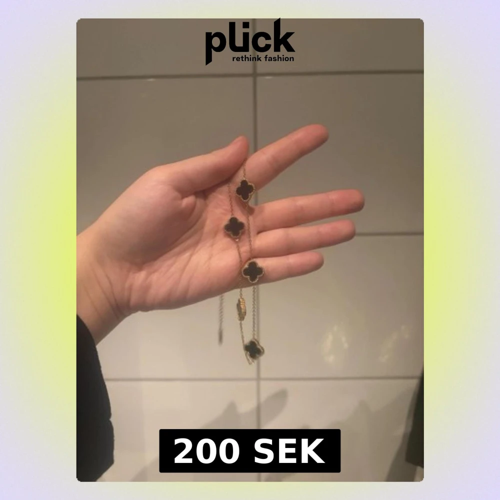 Snyggt armband i guldton med fyra svarta klöverformade hängen, omgivna av guldfärgade kanter. Kedjan är tunn och elegant, perfekt för dig som gillar stilrena accessoarer med en twist. Inspirerat av klassiska designer och passar till många olika looks.
