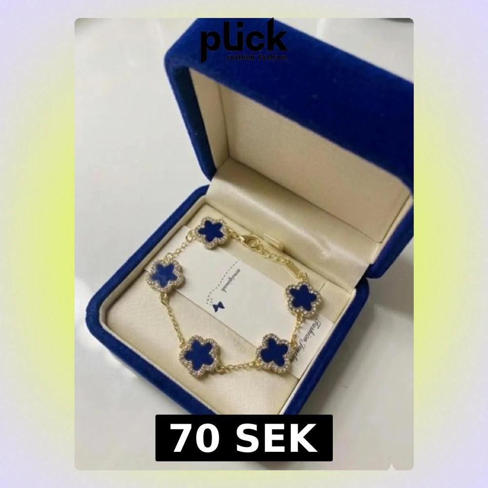 Snyggt armband i guldton med fem blå klöverformade hängen, kantade av små gnistrande stenar. Länken är tunn och justerbar för perfekt passform. Perfekt accessoar för att lyfta din outfit med en färgklick och elegant design.