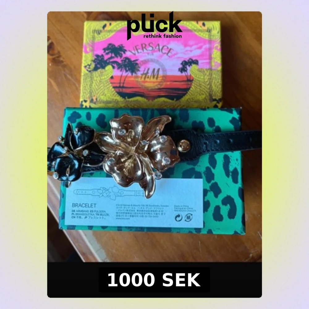Snyggt armband från Versace x H&M med stora blommor i guld och svart på ett svart band. Armbandet har en cool och unik design som sticker ut och passar perfekt för dig som gillar statement-smycken.