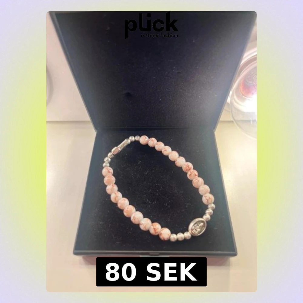 Snyggt armband med rundade pärlor i rosa och vitt, varvat med små silverfärgade pärlor. Armbandet har ett ovalt silverfärgat hänge med motiv och ett smidigt metallspänne. Perfekt accessoar för att lyfta din stil.
