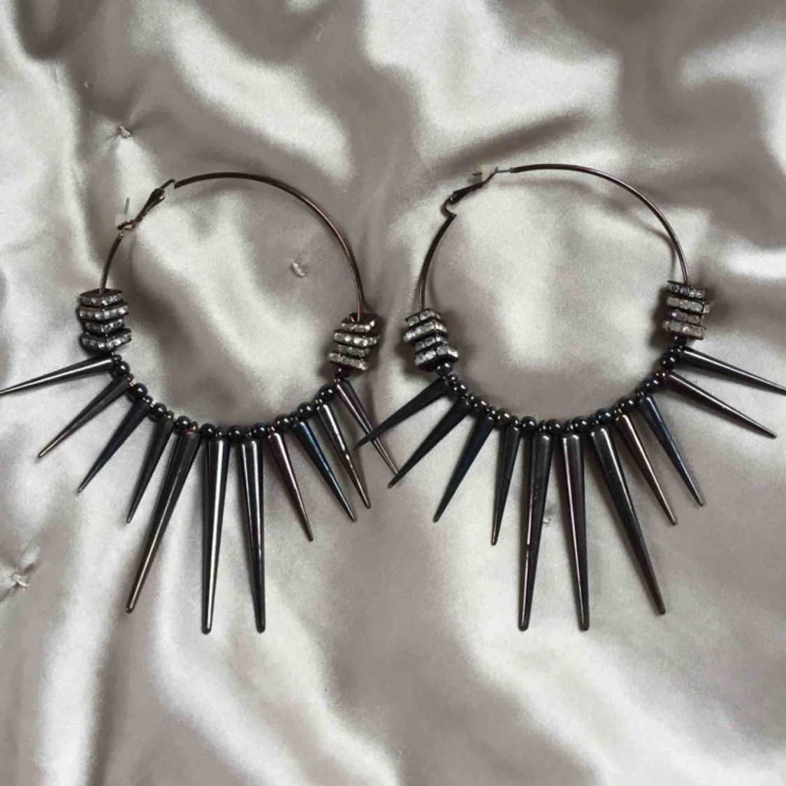 Mörklila runda örhängen med nitar och gnistrande stenar. De är väldigt lätta.