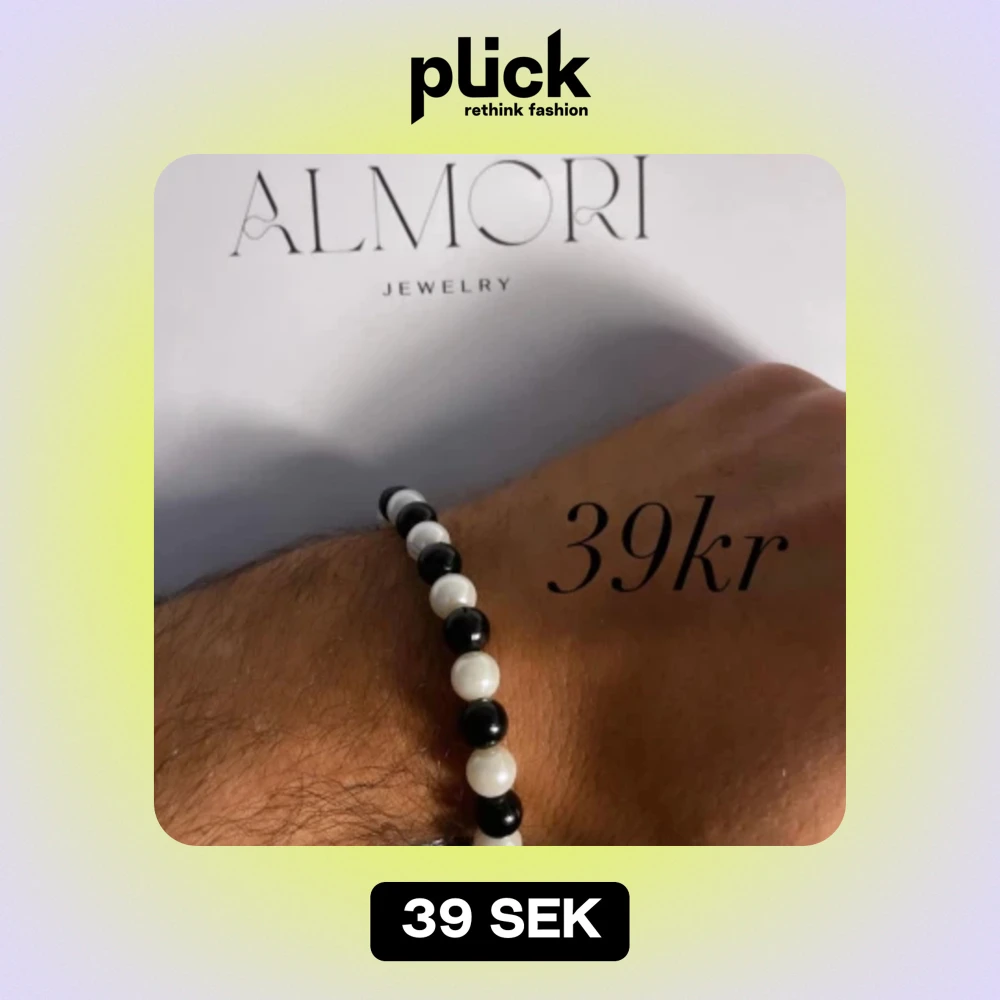 Ett stilrent armband från Almori med svarta och vita pärlor. Armbandet är elastiskt och passar de flesta handleder.