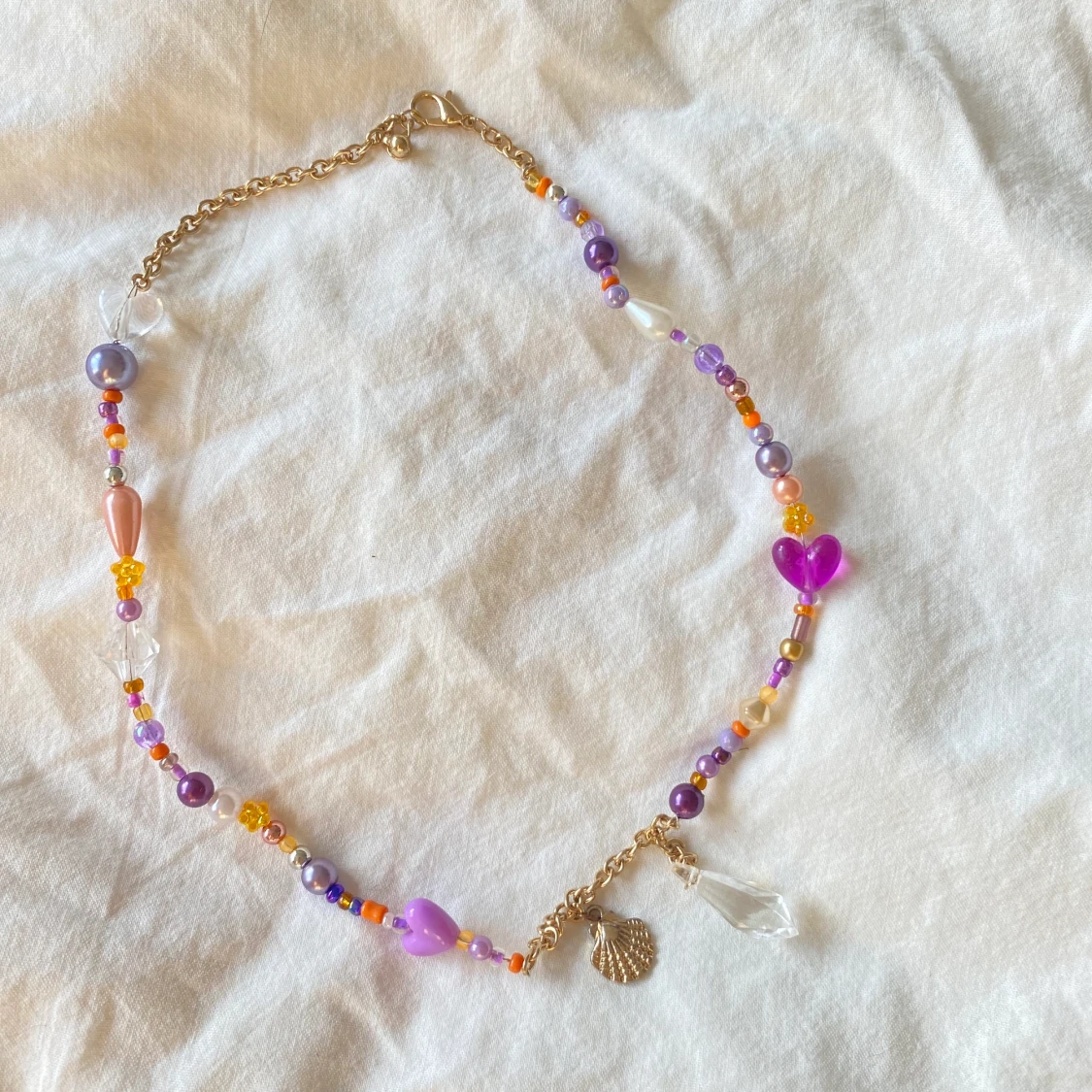Handgjort halsband i orange och lila, samt en guldig kedja och fina hängen. Skriv för mer bilder och mått! Frakt är inräknat i priset!