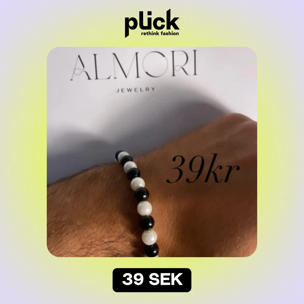 Ett elegant armband från Almori Jewelry med svarta och vita pärlor. Armbandet har en enkel och stilren design som passar till olika tillfällen.