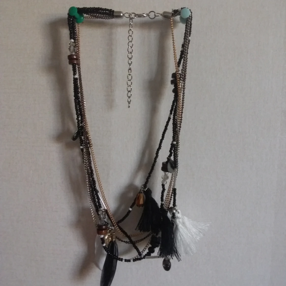 Halsband i flera lager med pärlor fjädrar och toffsar i svart vit silver och guldfärg