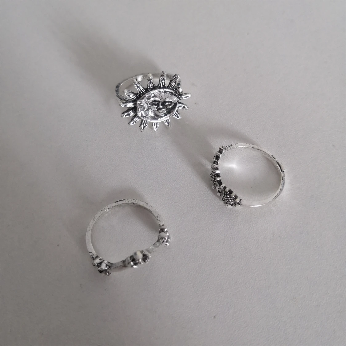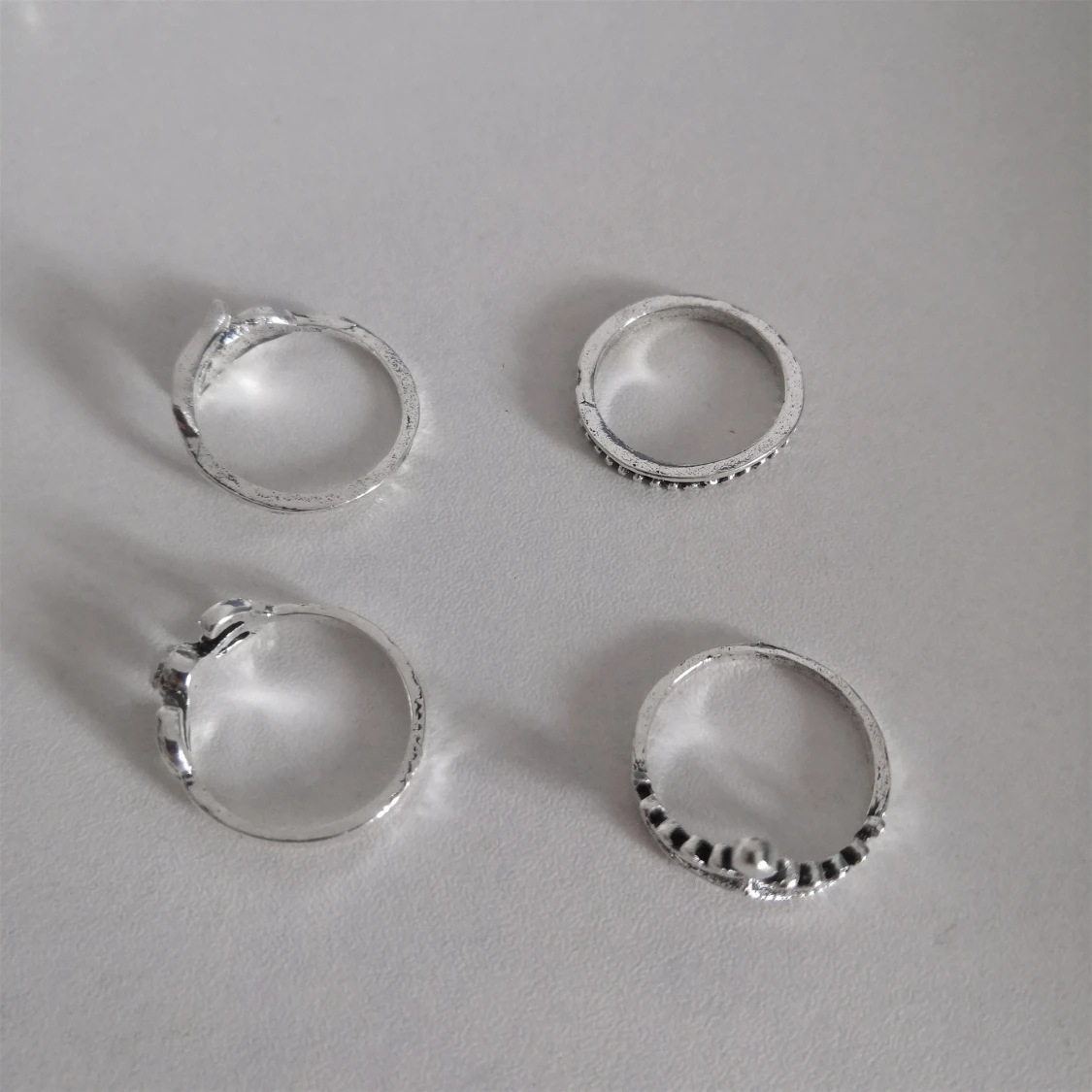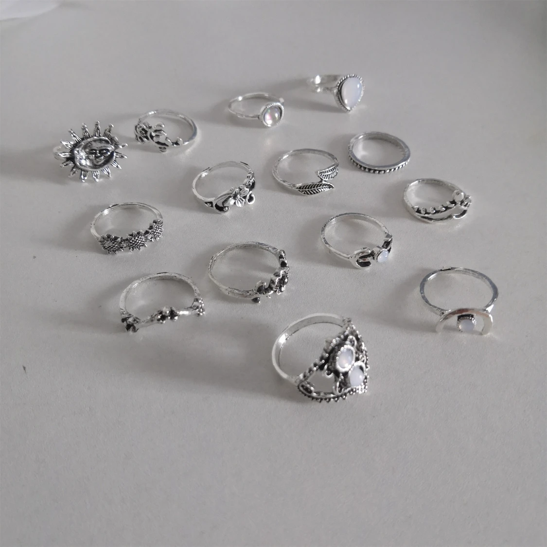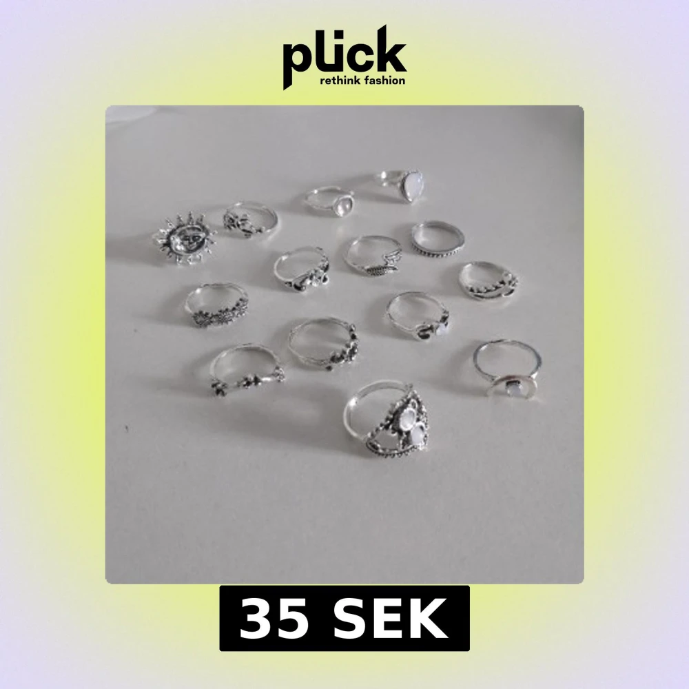 Säljer ett set med 14st silvriga ringar i olika former och mönster. Materialet är zink alloy