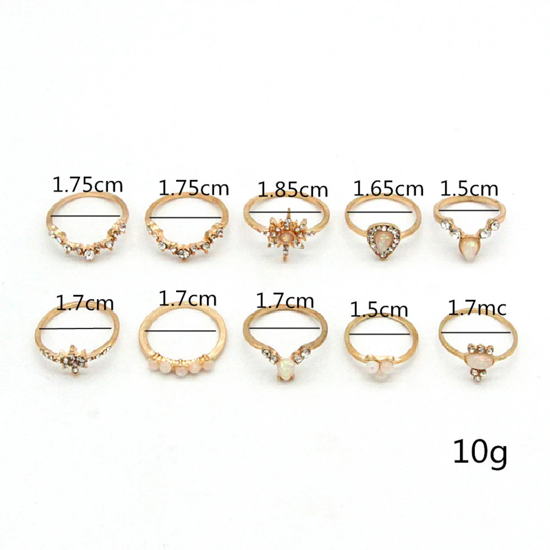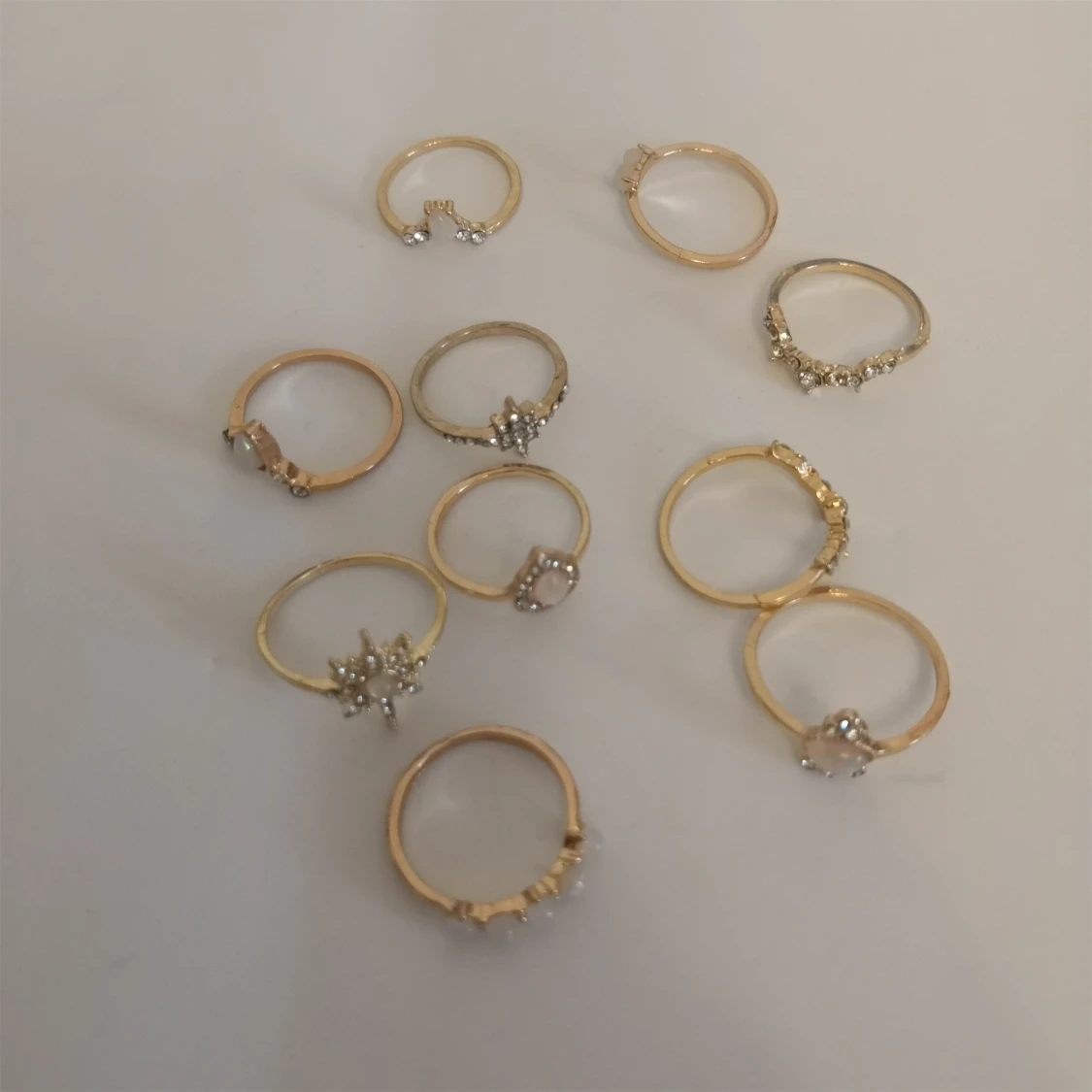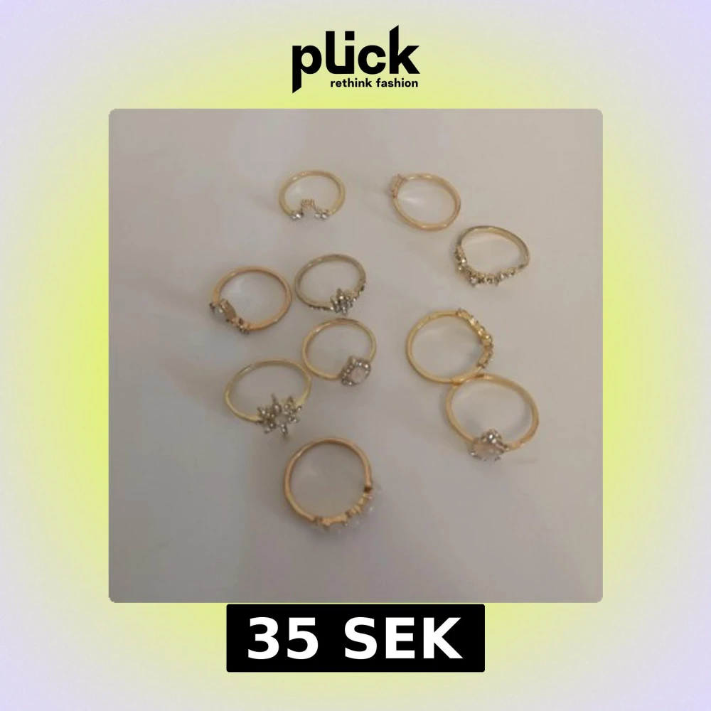 10 st guldiga ringar med olika former och detaljer. Perfekt för dig som gillar att mixa och matcha flera ringar på samma hand för en cool och personlig stil. Materialet är zinc alloy + rhinestones + resin. (300)
