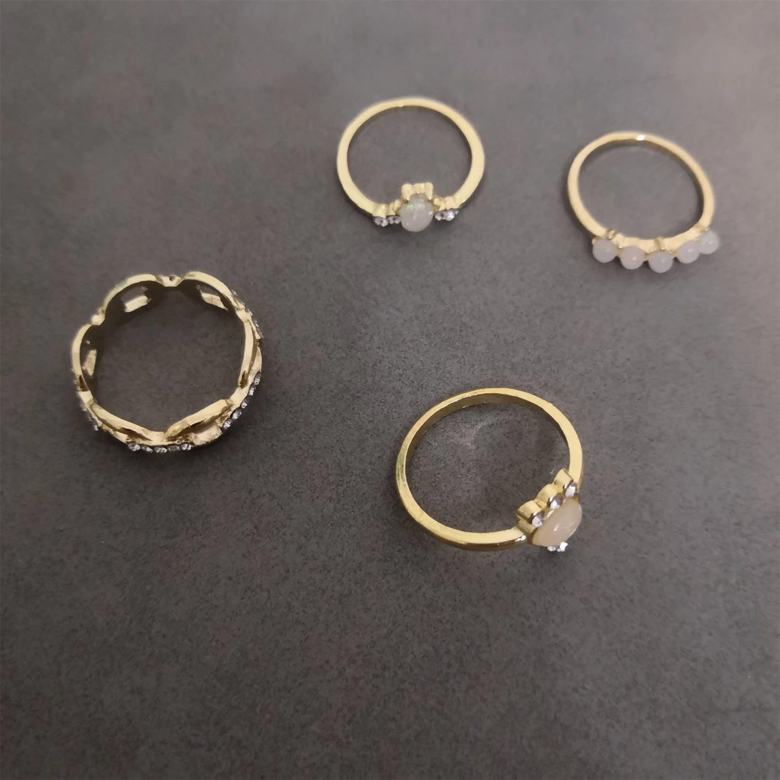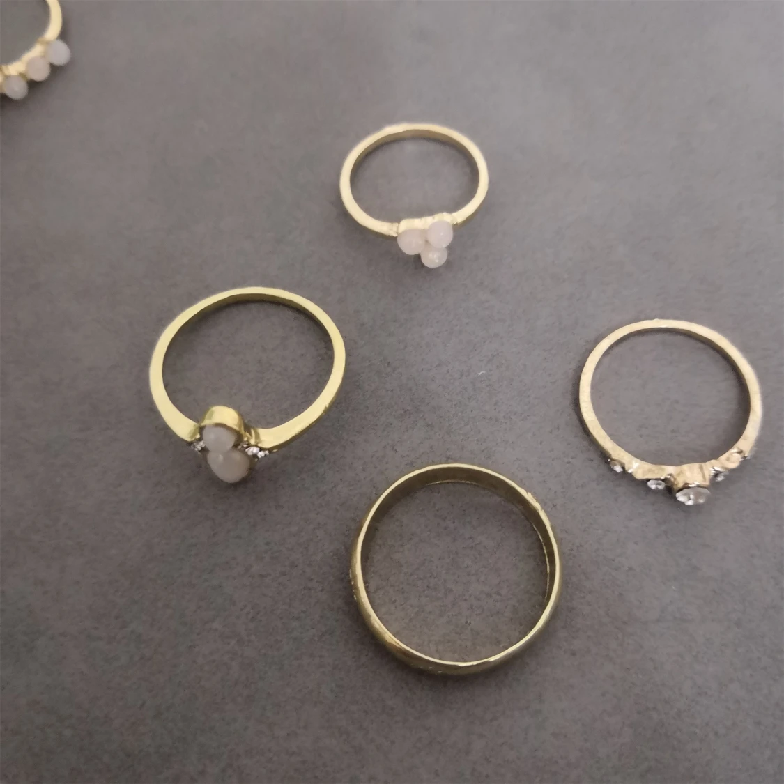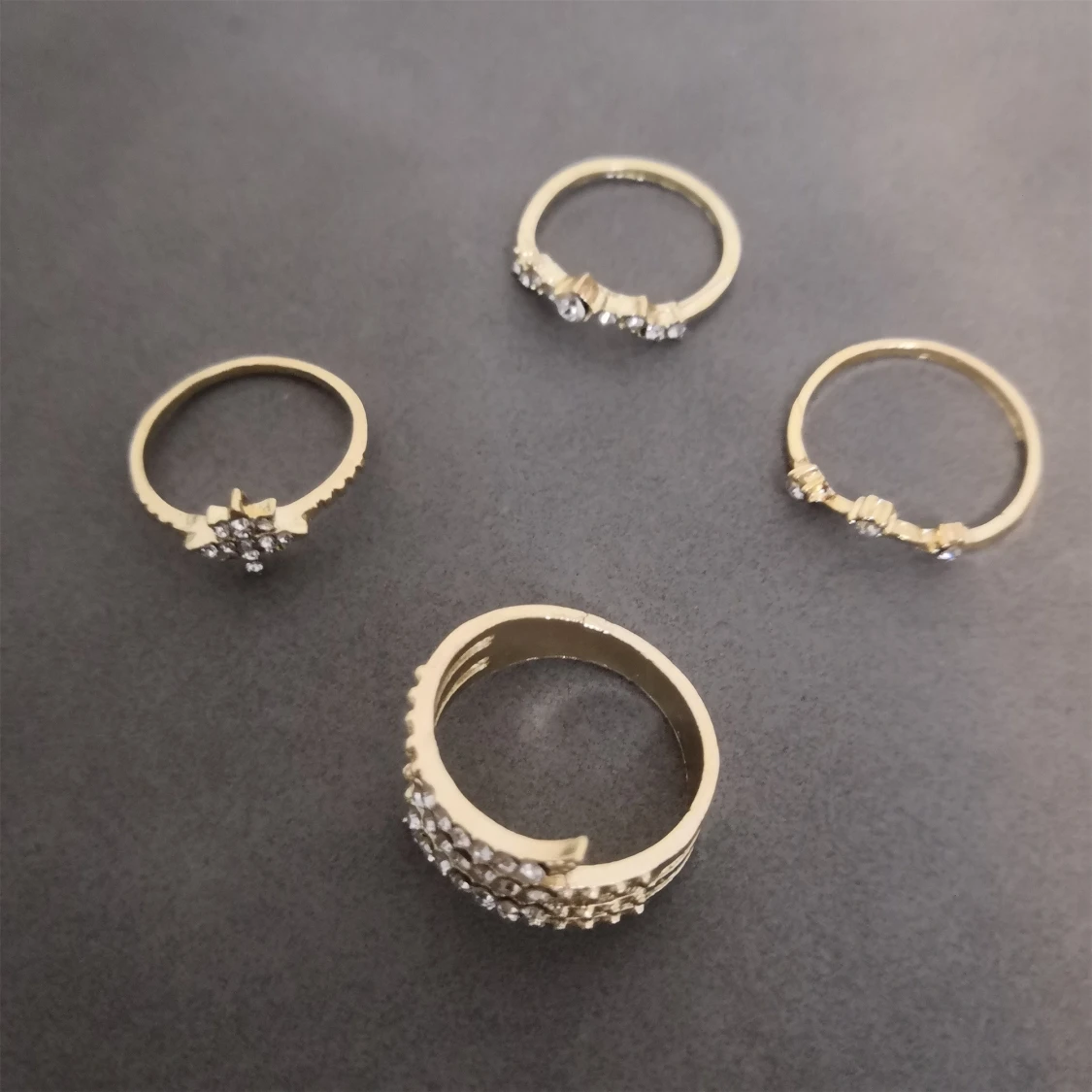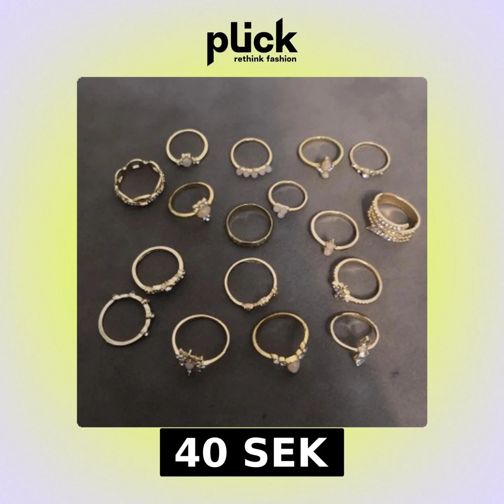 Säljer ett set med 17 snygga ringar i guldig färg. Ringarna har olika former och mönster. Perfekt för att mixa och matcha till din egen stil. Materialet är zinc alloy + rhinestones + resin. (302)