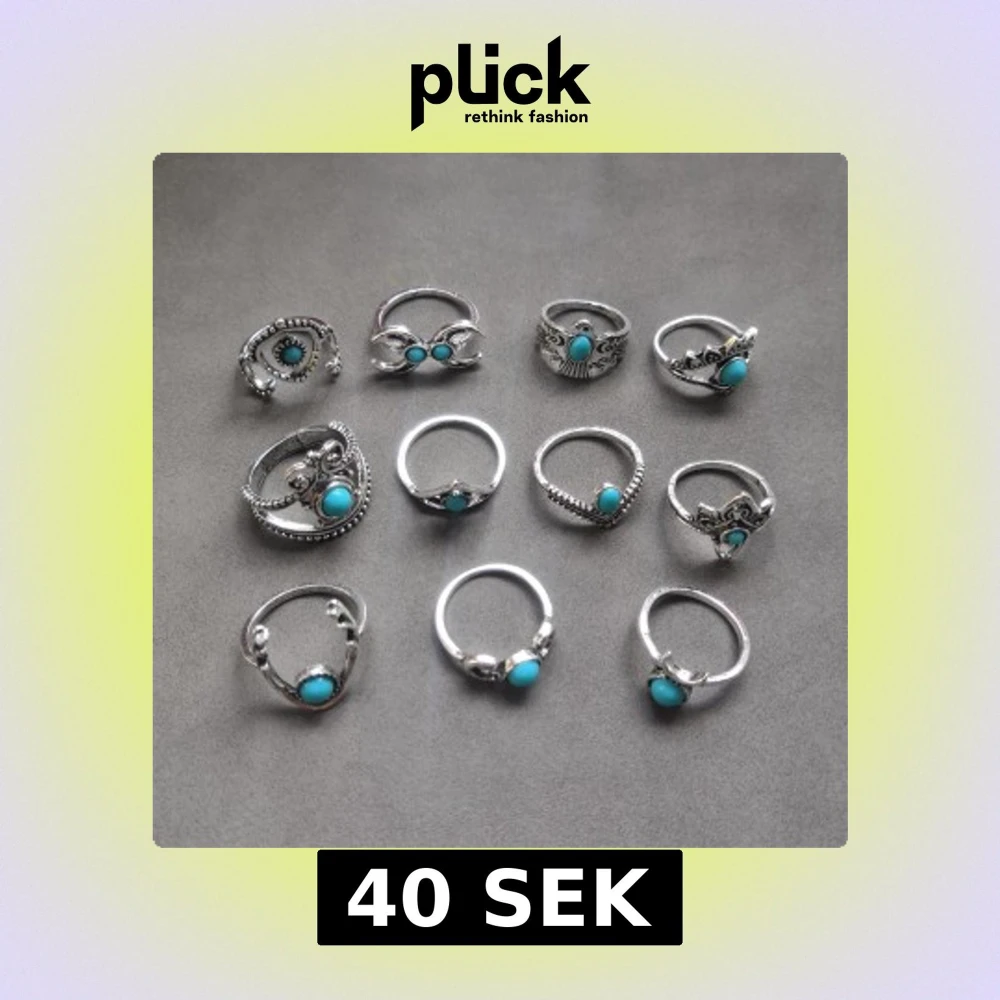 Säljer ett set med 11 snygga silverfärgade ringar med olika former och mönster. Perfekt för dig som gillar att mixa och matcha flera ringar på samma hand. Materialet är alloy. (600)