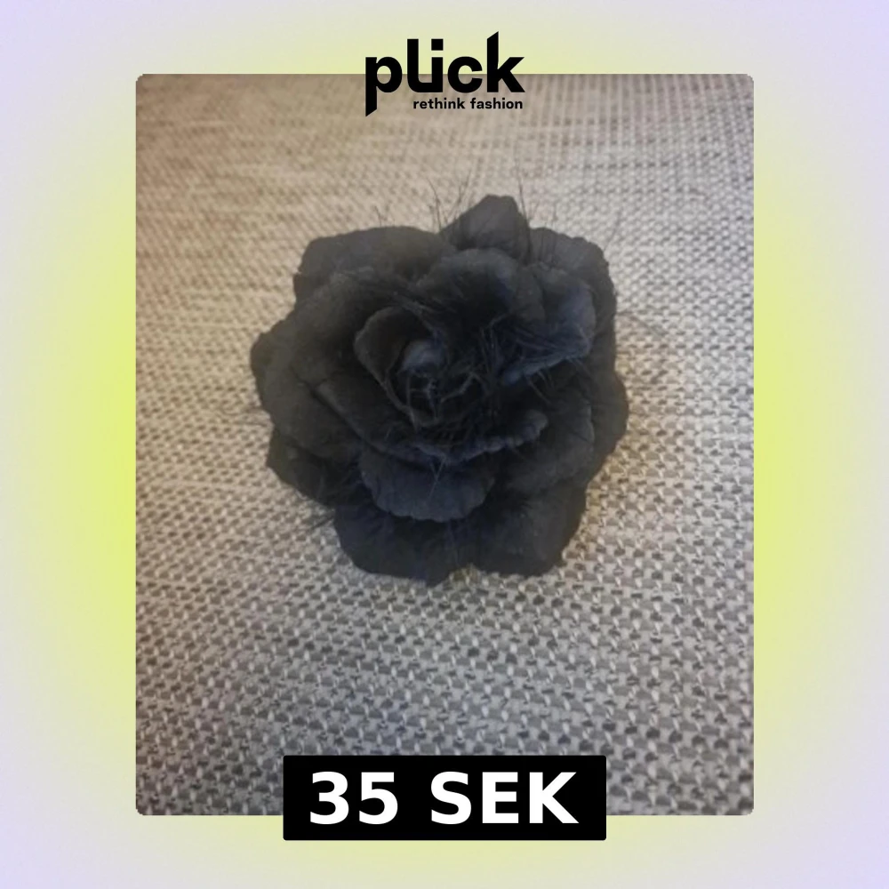 Snyggt svart diadem i form av en stor tygblomma med fjäderdetaljer. Fästes enkelt med metallklämma på baksidan eller nållåsning. Perfekt för att ge din look en cool och unik touch. Blomman är fluffig och har flera lager av mjukt tyg. Inga funna skavanker. Ø ca 10 cm