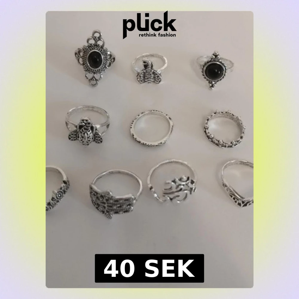 Säljer ett set med 10 st ringar i olika former och mönster. Materialet är alloy. (#641)