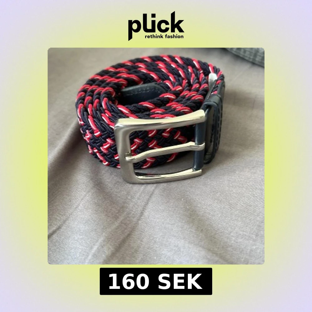 Helt nytt flätat bälte med coola svarta och röda detaljer samt inslag av vitt. Bältet har en silvrig metallspänne och mörkblå skinnpartier vid ändarna. Materialet är mestadels nylon med inslag av syntet och metall. Perfekt för att ge outfiten lite edge.