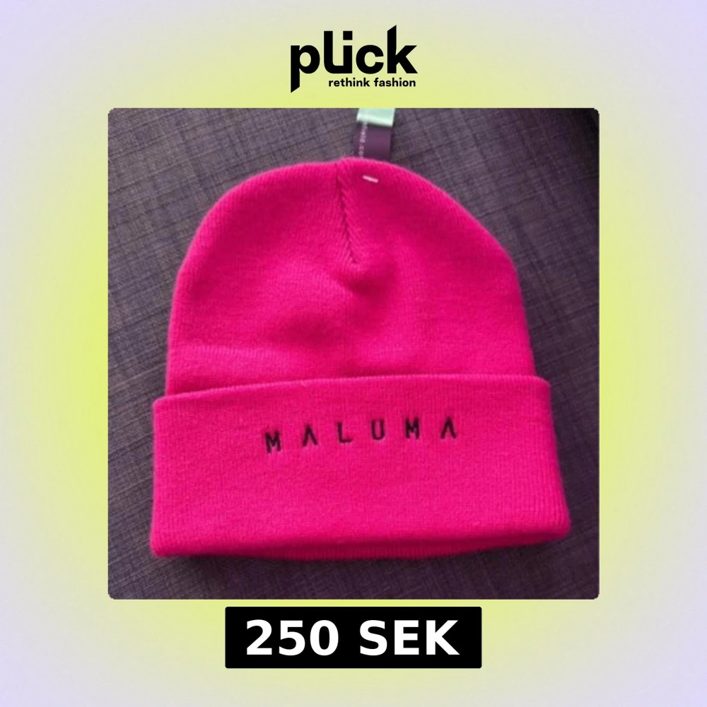 Snygg rosa mössa med uppvikt kant och broderad text 'Maluma' framtill. På baksidan finns en broderad triangel. Perfekt för att hålla värmen med stil.