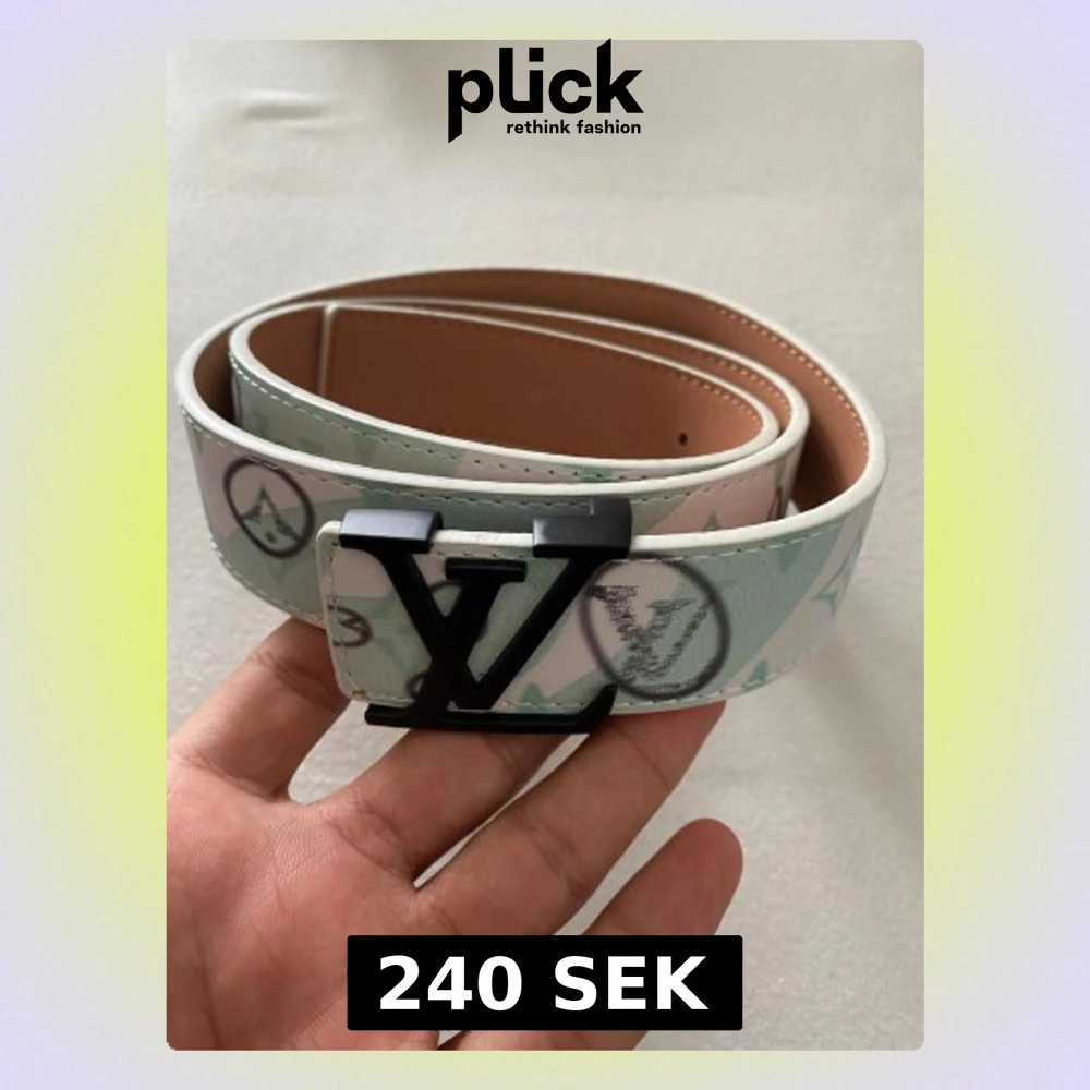 Snyggt Iv bälte i skinn med klassiskt Iv-monogram i mintgrön och vit färg. Bältet har en stor svart Iv-spänne och mönster med loggor och cirklar längs hela remmen. Perfekt för att lyfta din outfit med en lyxig touch.
