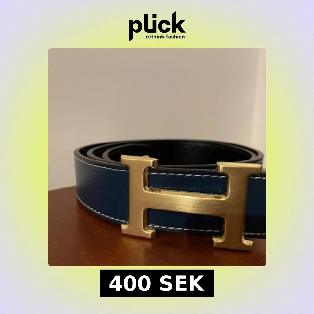 Snyggt bälte i blått och svart skinn med ett stort, guldigt H-spänne. Bältet har vit kontrastsöm längs kanterna och är tillverkat i exklusivt läder. Perfekt för dig som vill ha en statement-accessoar med lyxig känsla och klassisk design.