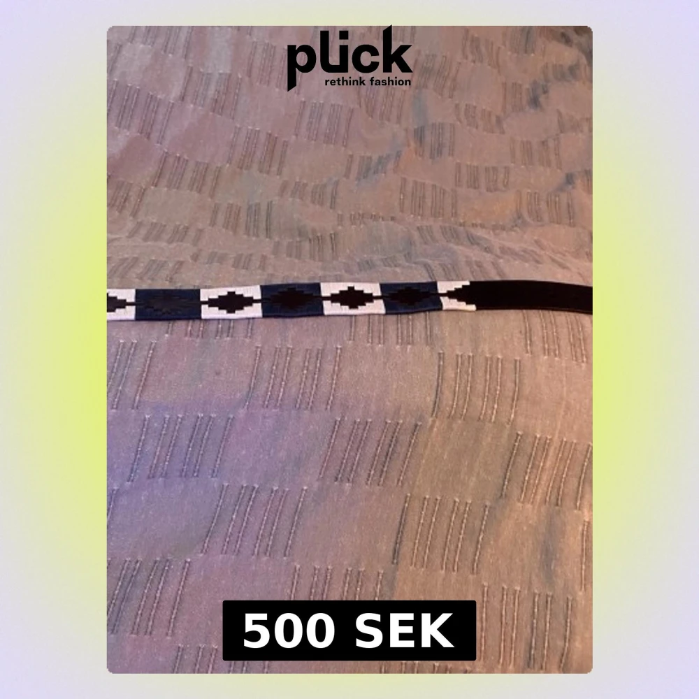 Säljer en svart skinnbälte med unikt geometriskt mönster i vitt och mörkblått. Bältet har ett smalt band med kontrasterande färger och cool rut-inspirerad design. Perfekt för dig som vill sticka ut och addera en edgy touch till din outfit. 110 cm långt.