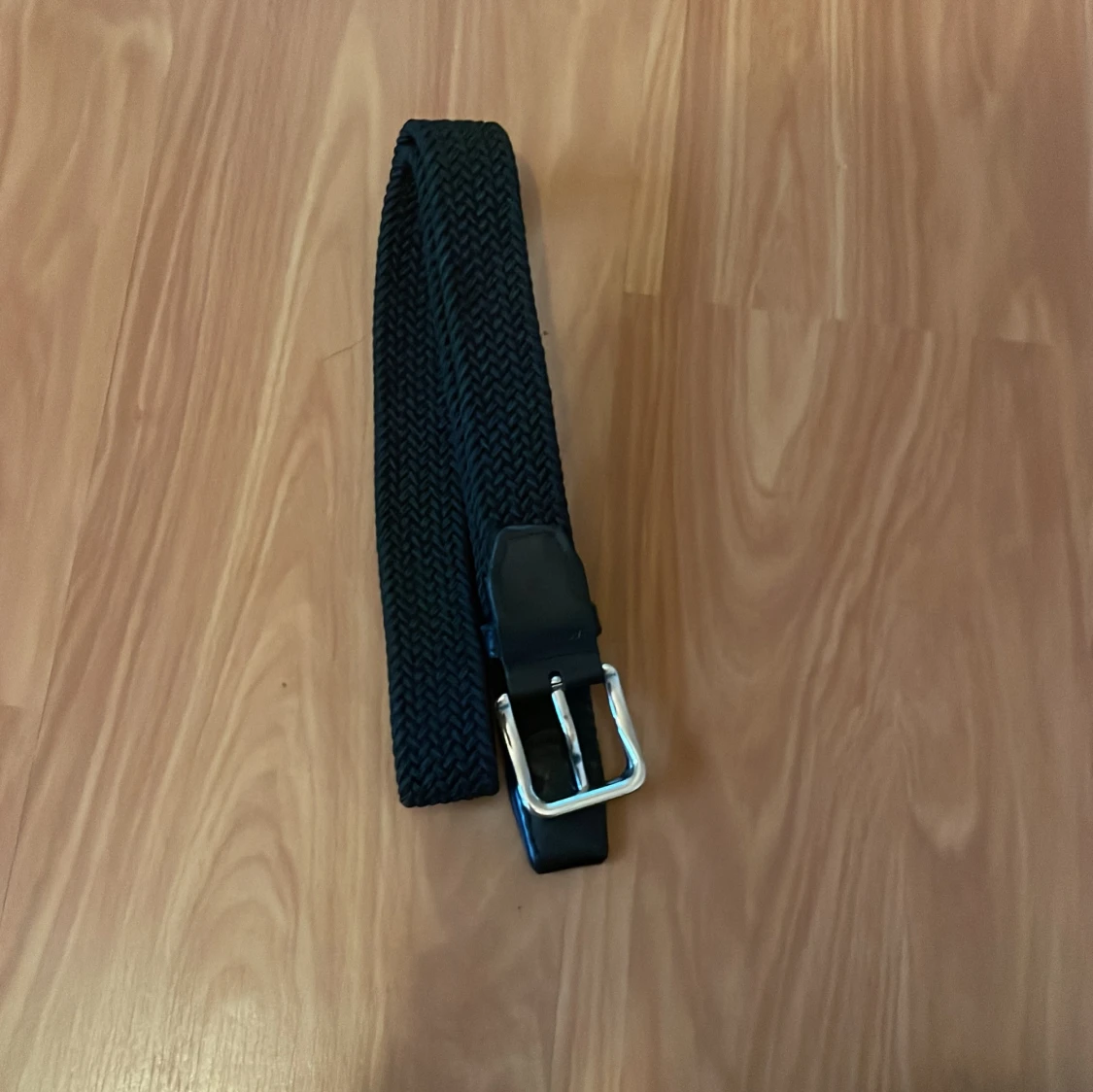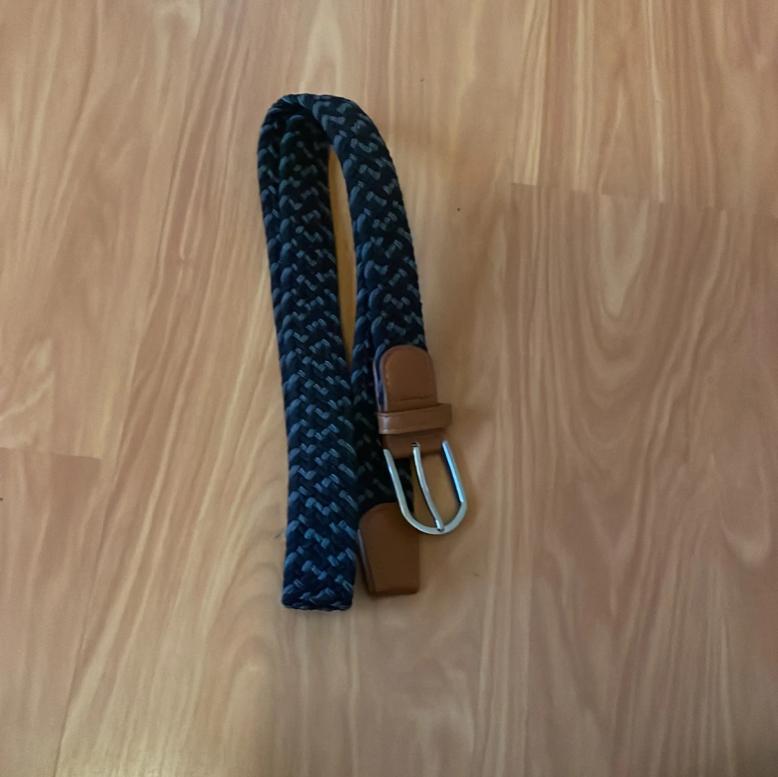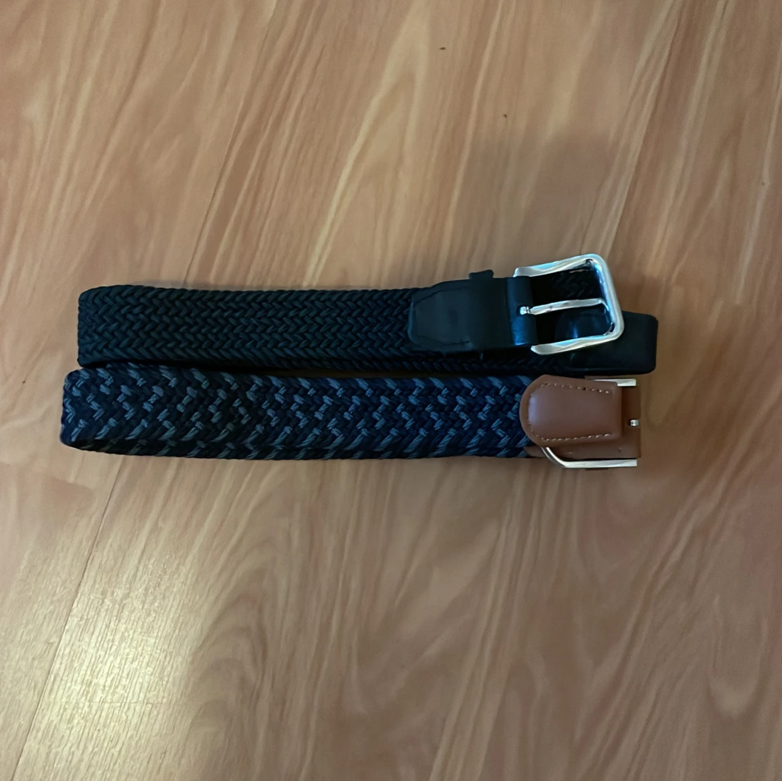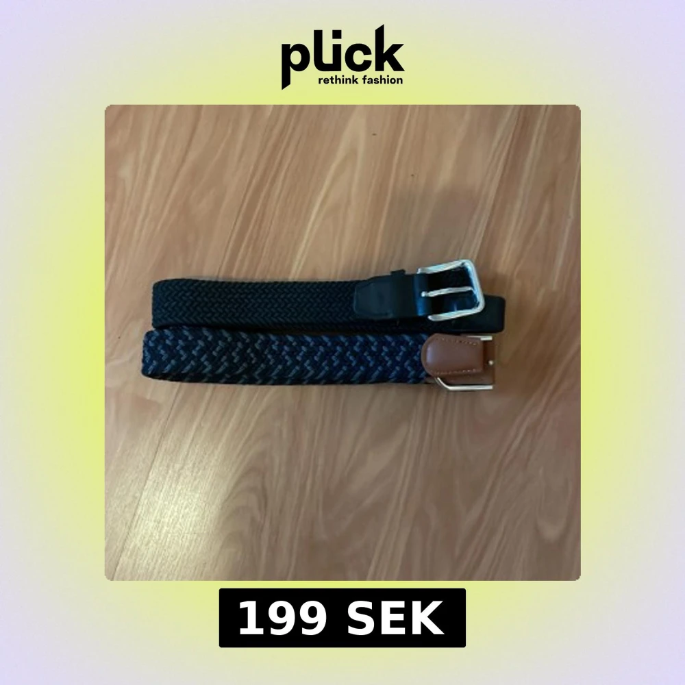 Säljer två snygga flätade bälten. Ett är helsvart med svart skinnimitation vid spännet och silvrigt spänne. Det andra är blått med inslag av grått och svart, har bruna detaljer i skinnimitation och silvrigt spänne. Perfekta för att lyfta din outfit.