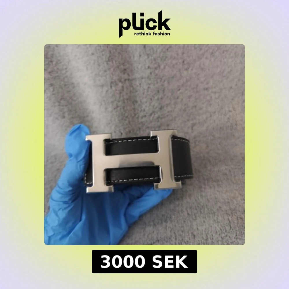 Snyggt svart skärp med ett stort H-format spänne i silverfärgad metall. Skärpet har vita sömmar längs kanterna och är tillverkat i slätt skinn. Perfekt för att ge outfiten en lyxig touch och passar till jeans eller kostymbyxor.