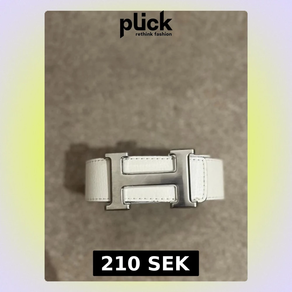 Säljer ett vändbart bälte i skinn med en stor H-formad metallspänne. Ena sidan är vit och andra sidan är svart, vilket gör det enkelt att matcha med olika outfits. Bältet har stilrena sömmar och en exklusiv känsla.