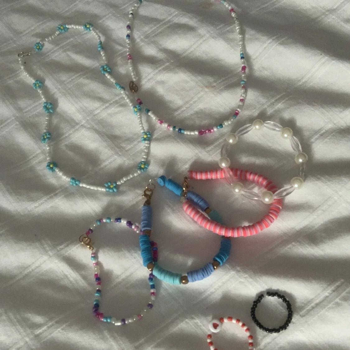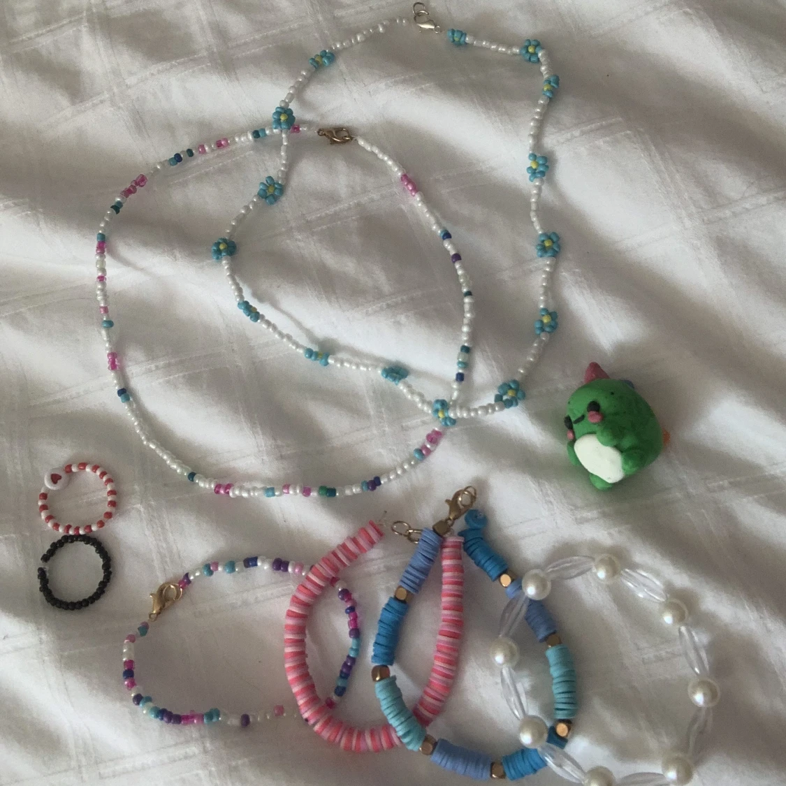 Jag säljer dessa smycken och denna lilla lerfigur Ring: 10 kr Armband: 15-25 kr Halsband: 25-30 kr Figur: 25 kr Exklusive frakt(priset kan variera beroende på vart du bor ifall det är högre frakt)
