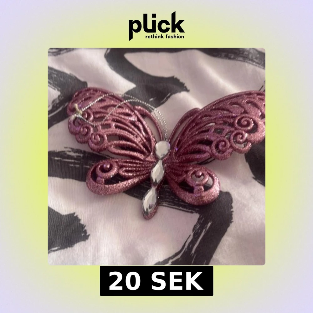 Säljer en dekorativ accessoar i form av en fjäril i glittrig rosa färg. Fjärilen har utskurna detaljerade vingar och tre stora, facetterade stenar på kroppen. Hängs upp med en tunn silverfärgad tråd.