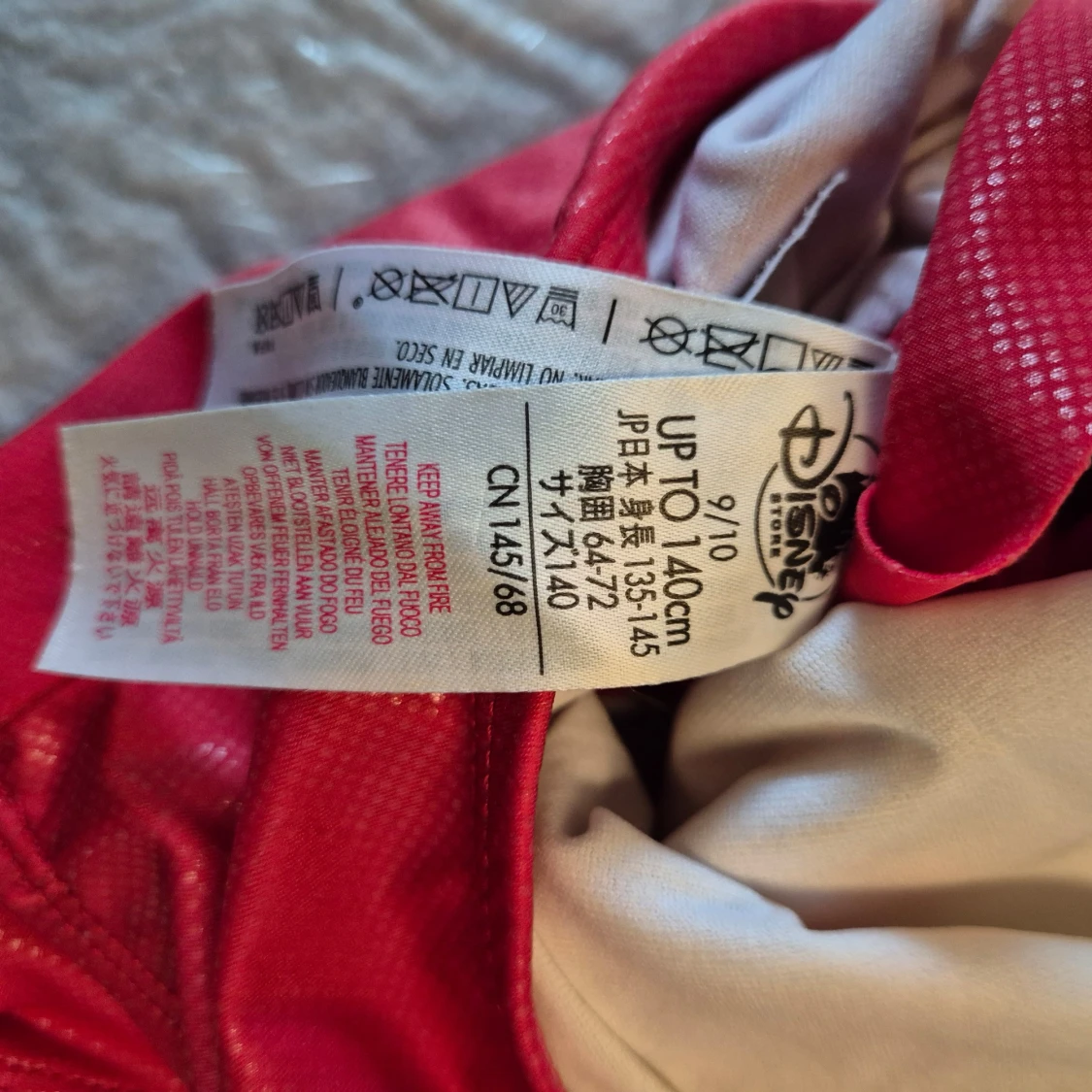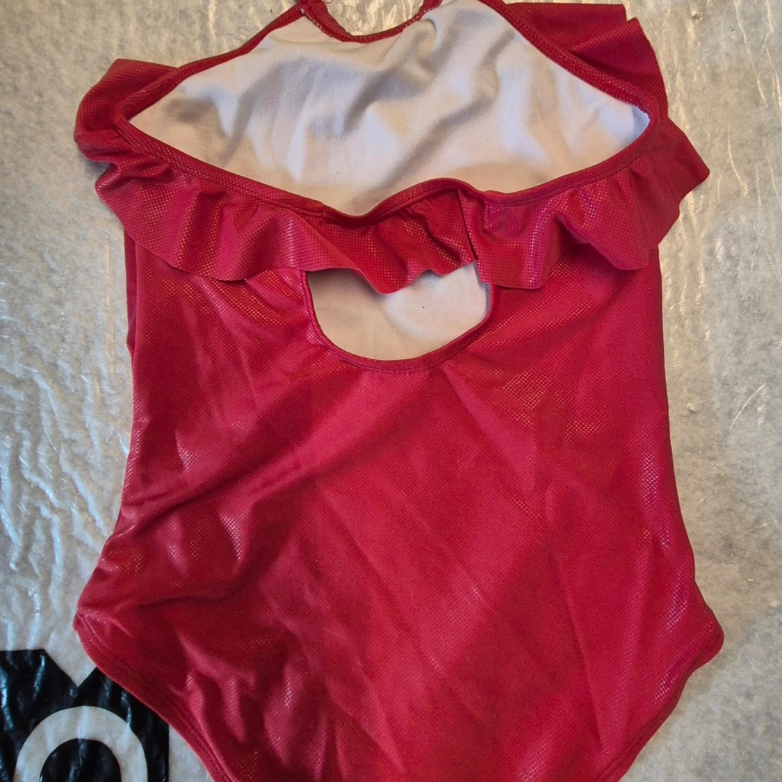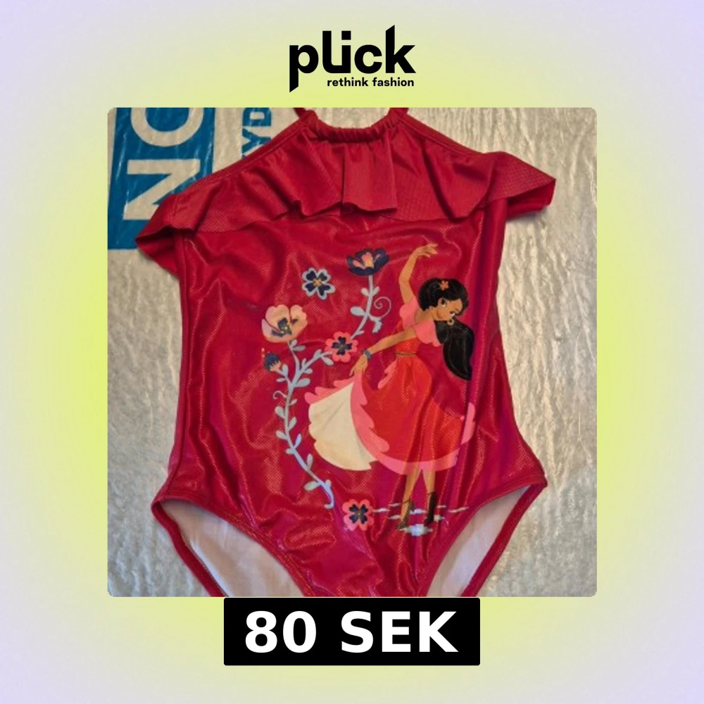 Säljer en röd baddräkt från Disney med volang upptill och ett stort tryck av en prinsessa och blommor på framsidan. Baddräkten har rund hals och är tillverkad i syntetmaterial. Perfekt för sommarens bad!