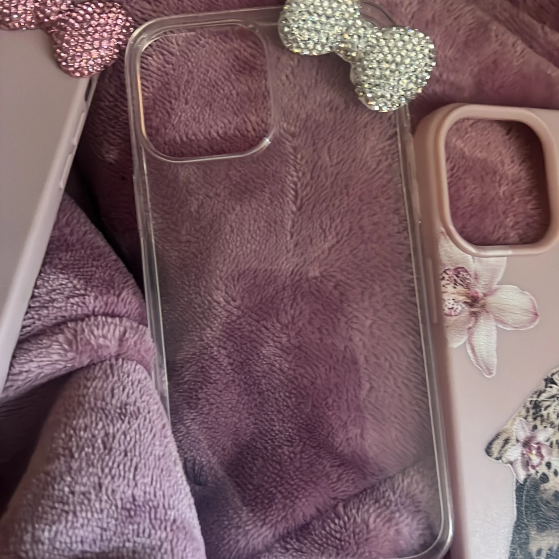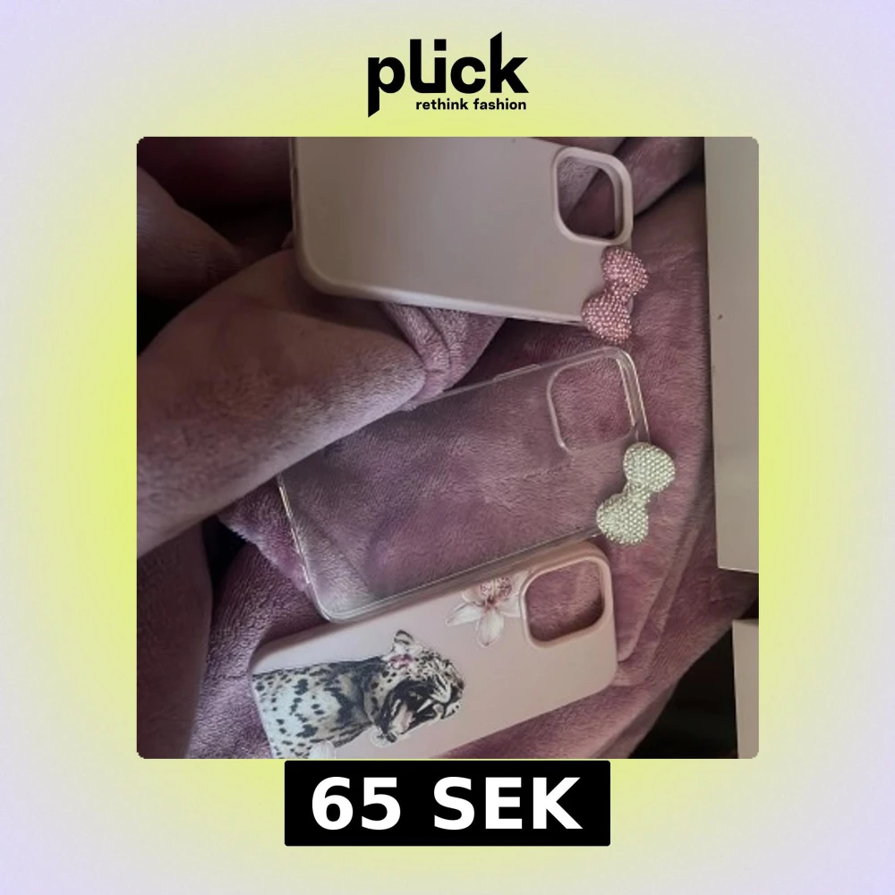Säljer tre olika mobilskal. Ett rosa med en glittrig rosett, ett genomskinligt med en silverglittrig rosett och ett rosa med blommor och leopardmotiv. Perfekt för att ge din mobil en personlig touch!